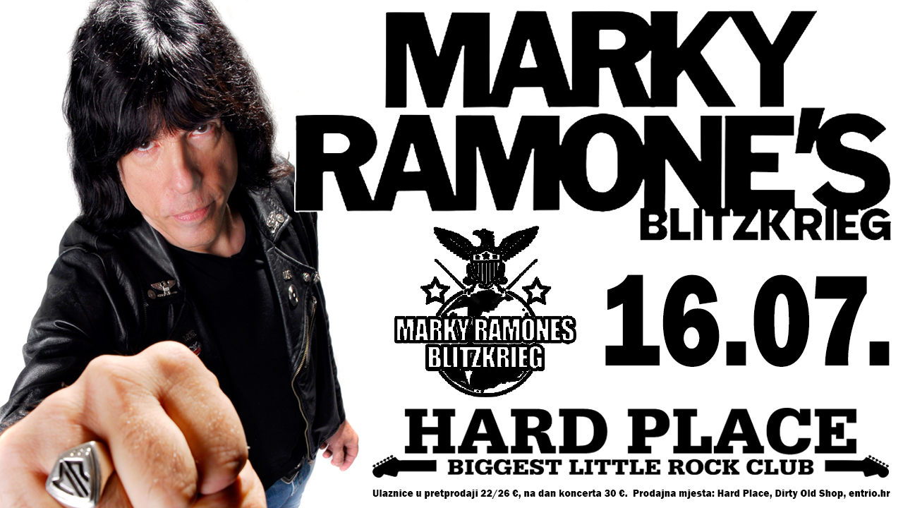 Upravo je potvrđeno da legendarni bubnjar Ramonesa MARKY RAMONE dolazi sa svojim bandom BLITZKRIEG u Zagreb održati ekskluzivni koncert u klubu HARD PLACE u srijedu 16.07.2025. Gledati i slušati bubnjara i jedinog živućeg člana legendarnih Ramonesa iz ‘70tih godina – Marky Ramonea u malom klubu na ekskluzivnom koncertu u Hard Placeu može se samo usporediti sa nekadašnjim svirkama Ramonesa u CBGB klubu u New Yorku gdje su započeli svoju karijeru. Broj ulaznica je limitiran i upravo su krenule u prodaju. Marky Ramone proveo je 15 godina svirajući bubnjeve za legende punk rocka Ramonese. 1978. baš u klubu CBGB ga je Dee Dee Ramone pozvao da se pridruži Ramonesima i odmah potom je snimio legendarni album “Road to Ruin” i možda najveći hit banda svih vremena “I Wanna Be Sedated”. Slijede albumi “Rock’n’Roll High School” i “End Of The Century”. Nakon nebrojenih turneja i još dva albuma, Marky je dobio otkaz 1983., ali već se četiri godine kasnije vraća u band i ostaje sa njima do definitivnog razlaza banda 1996. Statistike kažu da je odsvirao preko 1700 koncerata sa Ramonesima i objavio više od 15 albuma. Na kraju karijere napisao je i neke pjesme na zadnja dva autorska albuma “Mondo Bizarro” i “Adios Amigos”. Kada je 2000. Joey Ramone snimao svoj solo album “Don’t Worry About Me” za bubnjevima je ponovo bio Marky. Sa originalnom postavom je 2001. primljen u Rock’n’roll kuću slavnih, a 2010. je primio i Grammy nagradu za životno djelo. Iako su Ramonesi otišli u povijest (Dee Dee je umro od droge, Johnny, Joey i Tommy od raka) Marky Ramone još uvijek svira i širi nasljeđe legendi punk rocka sa svojim bandom Marky Ramones Blitzkrieg sa kojima ćemo ga vidjeti u Zagrebu na turneji. U nekoliko prijašnjih gostovanja oduševili su zagrebačku publiku, pa ni ne sumnjamo da će svi oni sretnici koji uspiju na vrijeme nabaviti svoju ulaznicu uživati u ovom ekskluzivnom koncertu. Early bird ulaznice po cijeni od 22 eura do 15.06., nakon toga po cijeni od 26 eura, a na dan koncerta 30 eura. Pogledajte cijeli program Hard Placea 06.06. petak – PUNK RADIO, PORUKA U PRAZNO 07.06. subota – BAD RED BUNNY 10.-15.06. 10th BIGGEST LITTLE ROCK FESTIVAL 10.06. utorak – ROCK KVIZ 11.06. srijeda – JENNY DON’T ANT THE SPURS,FIRED GUNS, MELEWAI 12.06. četvrtak – PINE HILL HIANTS (U.S.A),GATUZO, CORTO 13.06. petak – SAVRŠENI MARGINALCI,EKSODUS, MLADI ZUMBULI 14.06. subota – DALEKA OBALA JAKŠE I HREPE,LILI GEE, HEIDI ŠECE PSA 15.06. nedjelja – predstava KUZIŠ STARI MOJ 18.06. srijeda – BUREX 20.06. petak – REFORMATORI 21.06. subota – ALERGIJA, TAFT 25.06. srijeda – APOTHEUS (Portugal) 26.06. četvrtak – HOOTEN HALLERS (U.S.A.) 27.06. petak – KAL’S PENNY, TRIP TO CALDERA 04.07. petak – BELLRAYS (U.S.A.) 16.07. srijeda – MARKY RAMONE’S BLITZKRIEG 19.07. subota – METALLICA by INCITER 06.09. subota – ROSALIE CUNNINGHAM (U.K.) 20.09. subota – KUD IDIJIOTI TRIBUTE LUTKE NA KONCU 04.10. subota – EDDIE VAN HALEN MEMORIAL CONCERT 07.10. utorak – MEPHISTOFELES, OMEGA SUN 11.10. subota – PANONSKI MORNAR TRIBUTE 17.10. petak – KISS TRIBUTE (ITALY) 22.10. srijeda – JEREMY HARRY HARRIS (AUSTRALIA) 25.10. subota – SURFER JOE (ITALY) 31.10. petak – HALLOWEEN PARTY